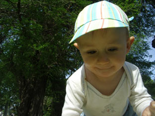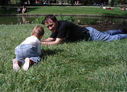 ensuite on est allés se reposer dans l'herbe du Parc Borely, et papa a joué au ballon avec moi ; et puis j'ai découvert quelque chose de très drôle : maman a un petit trou au ventre !