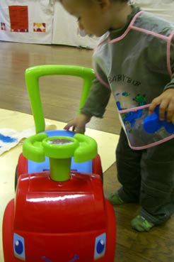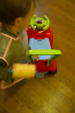 mais moi je fais le coquin, je chippe tous les rouleaux et les éponges et je les planque dans le coffre du petit camion
